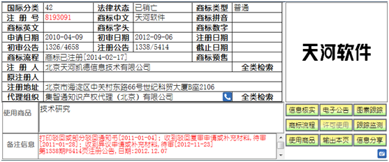 1、核心障碍商标(引证商标一:天河软件)被成功予以撤销。