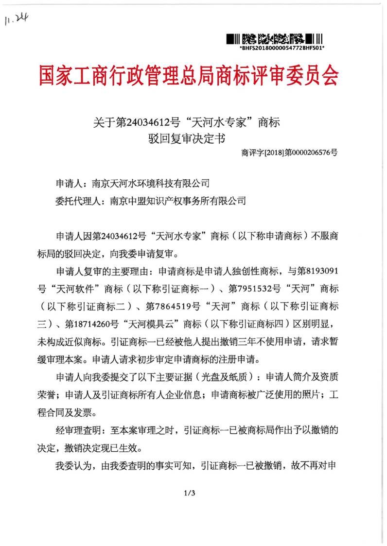 2017年05月09日,南京天河水环境科技有限公司在第42类“气象预报,建筑制图,包装设计,材料测试,水下勘探,计算机软件设计,提供互联网搜索引擎,生物学研究,水质分析,通过网站提供计算机技术和编程信息”等具体服务上申请了的第24034612号 商标。但是,很遗憾,2018年04月6日商标局发出驳回通知书,驳回该商标部分服务项目。