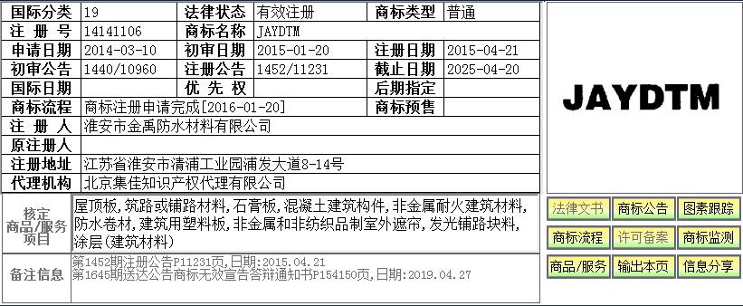 然而,争议商标“JAYDTM”于2014年3月10日申请,并于2015年4月21日获得商标注册公告。该商标完整地包含了申请人在先的“DTM”商标,同时并存在防水卷材等商品上,容易造成相关消费者混淆和误认。因此在我所的积极建议下,申请人同意委托我所针对第14141106号“JAYDTM”商标提起无效宣告程序。通过我所法律服务团队的努力,第14141106号“JAYDTM”商标最终在“防水卷材、发光铺路块料”商品上被成功无效。