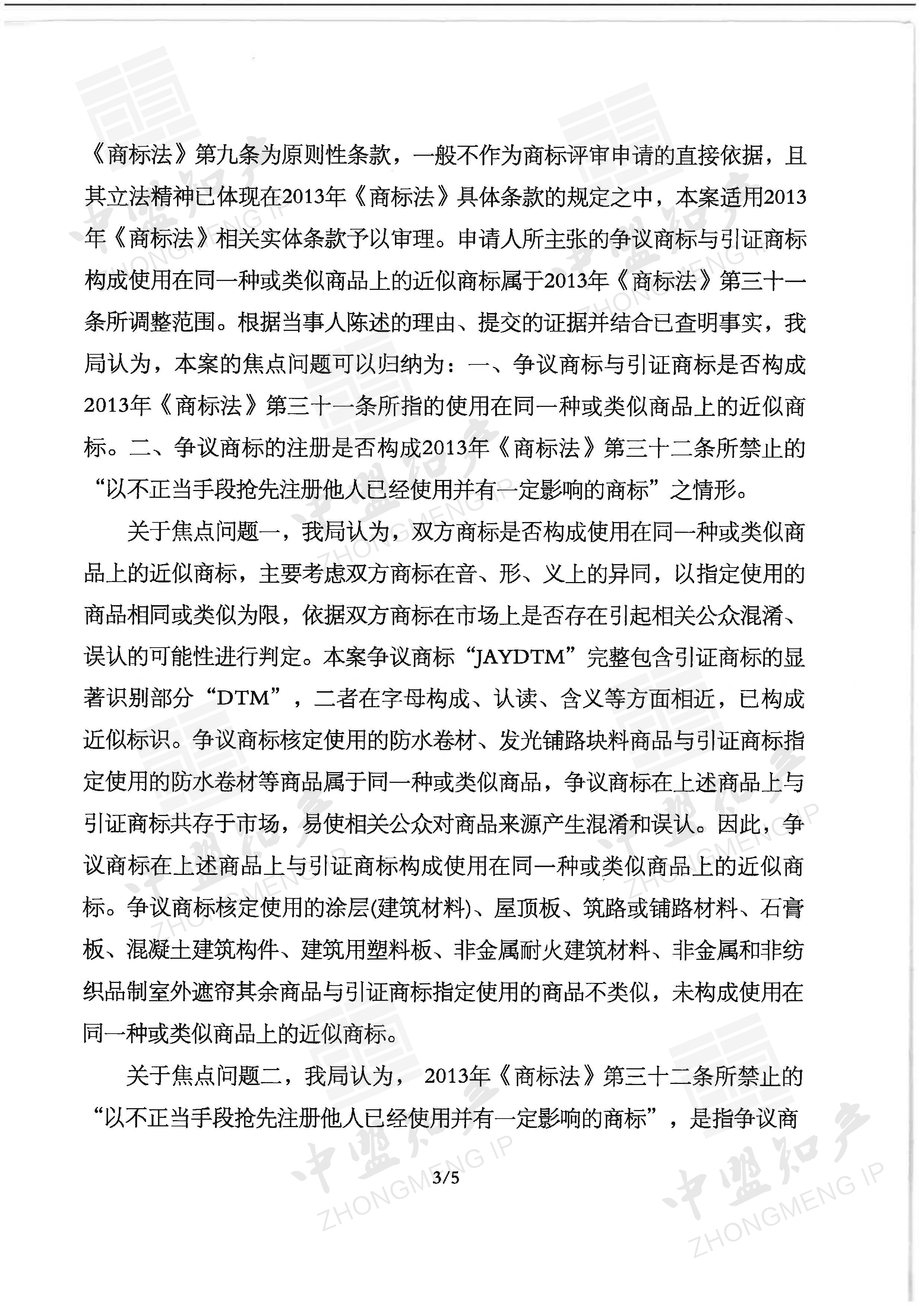 2.申请人于2013年3月27日递交引证商标“DTM”商标的申请。虽然在申请过程,起初被商标局予以部分驳回,但在申请人经过多年的法律诉讼程序和其他商标救济程序的争取,最终在核心商品“防水卷材、发光铺筑材料、非金属建筑物”项目上取得商标权利。因此,根据商标在先申请原则,争议商标申请时间晚于申请人引证商标申请时间,对于争议商标应当予以无效。