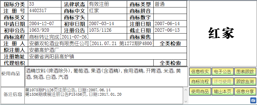1、调查安徽双轮酒业公司的酒瓶外观专利的申请情况,从侧面确认其是否有“红家”商标品牌。