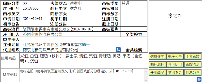 当事人苏州宇顺物流有限公司在2014年10月11日向商标局申请注册“家之红”商标,该商标的使用商品项目是“米酒,白酒,烈酒(饮料),威士忌,清酒,汽酒,青稞酒,黄酒,果酒(含酒精),烧酒”,但该商标在商标初审阶段就因为与“红家”商标近似度较高而被驳回,我所在继续为当事人针对“家之红”商标进行驳回复审程序的同时,了解到“红家”商标的权利人双轮公司在近三年并未在该商标指定的商品类别上对其有任何实际使用,因此我所夏月莲女士受苏州宇顺物流有限公司的委托,以其名义于2016年6月27日对“红家”商标提起了连续三年不使用撤销程序,通过撤销诉争商标,排除当事人商标申请的在先权利障碍。