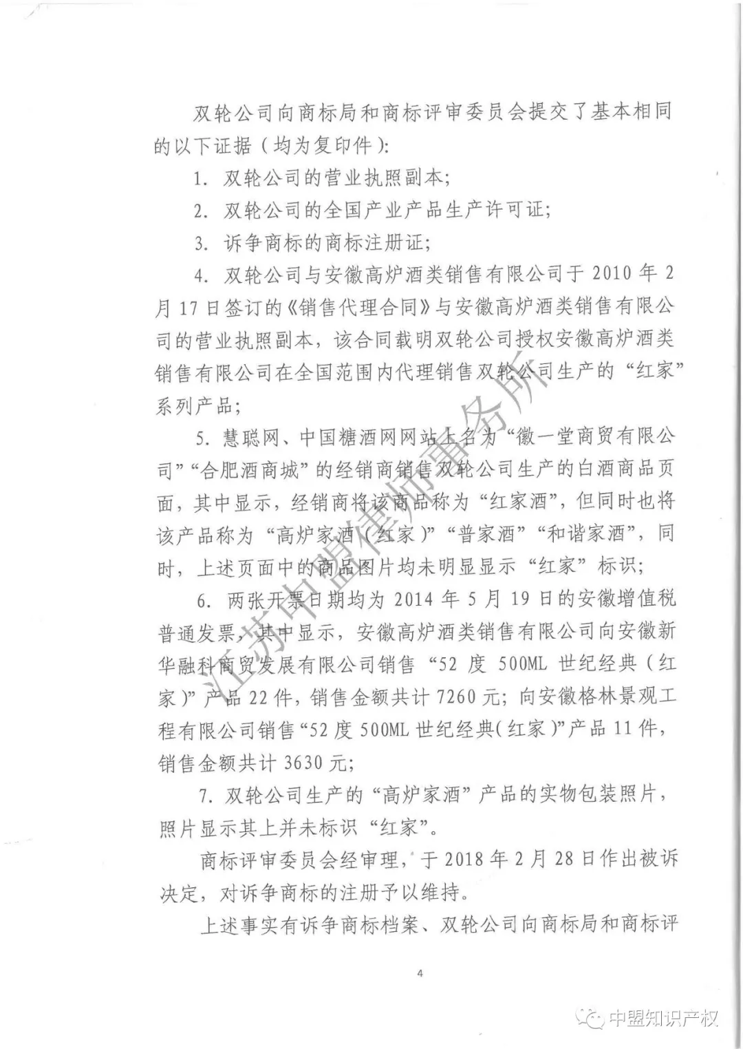 在撤销复审阶段,双轮公司向商评委提交了其在指定期间使用诉争商标的证据,主要包括与安徽高炉酒类销售有限公司签订的《销售代理合同》、2张销售发票、销售网站上的商品截图以及一些其他主体资质文件等。商评委通过审查后认为上述证据能够证明双轮公司对诉争商标进行了真实、有效、合法的使用,因此于2018年2月28日做出决定,对诉争商标的注册予以维持。