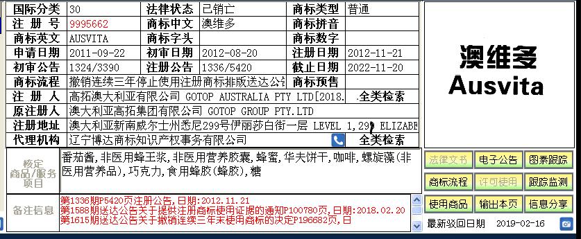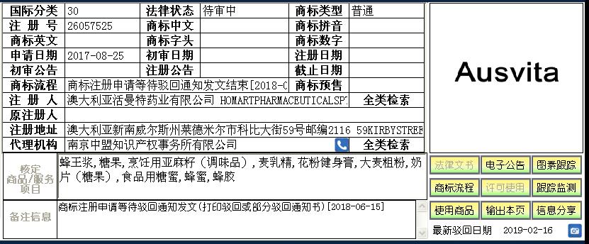 澳大利亚活曼特药业有限公司于2017年8月25日在第30类“大麦粗粉,食品用糖蜜,麦乳精,蜂蜜,蜂胶,花粉健身膏,蜂王浆,糖果,烹饪用亚麻籽(调味品),奶片(糖果)” 上申请注册“Ausvita”商标,注册号为26057525。在提交该商标注册申请阶段,我所就同时建议了活曼特公司对在先障碍商标提撤销三年不使用程序。