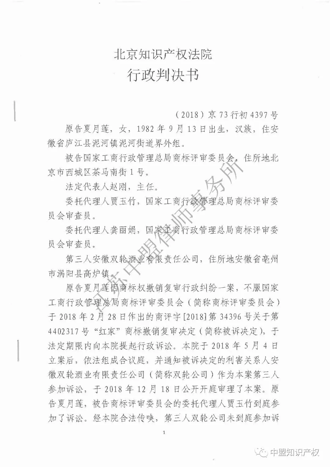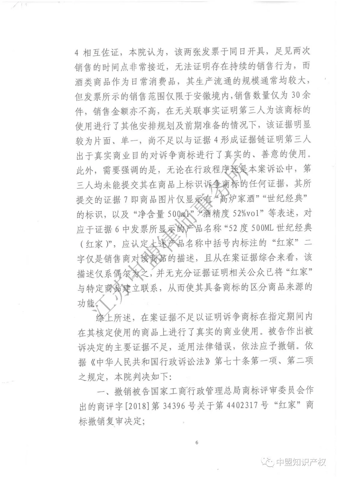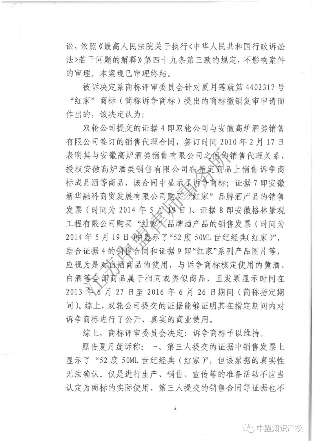 若不进一步推进撤销程序,诉争商标就不会被撤销,将大幅降低当事人“家之红”商标成功注册的成功率,加之我所认为商评委对证据的审查存在一定错误,因此当事人在我所的建议下,继续针对诉争商标委托我所向北京知识产权法院提起行政诉讼程序。