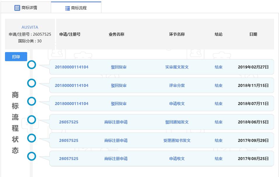 至此,申请人对障碍商标的撤三程序成功,以及对申请注册在第30类的“Ausvita”商标驳回复审程序成功,最终申请人的“Ausvita”商标在核心商品上得以顺利通过审核,目前等候排版公告。