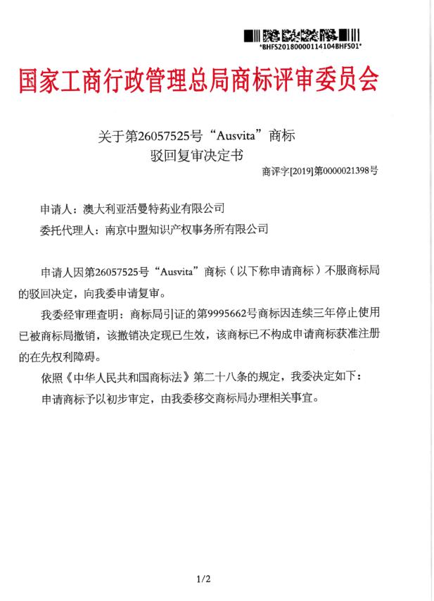 附:第26057525号“Ausvita”商标驳回复审决定书!