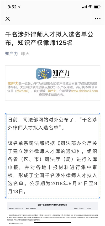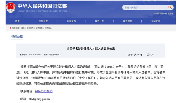 日前,司法部网站对外公布了,“千名涉外律师人才拟入选名单”, 该名单系司法部根据《司法部办公厅关于建立涉外律师人才库的通知》,组织各省(区、市)司法厅(局)进行入库申报,并对各地申报材料进行集中审核,形成了全国千名涉外律师人才拟入选名单。